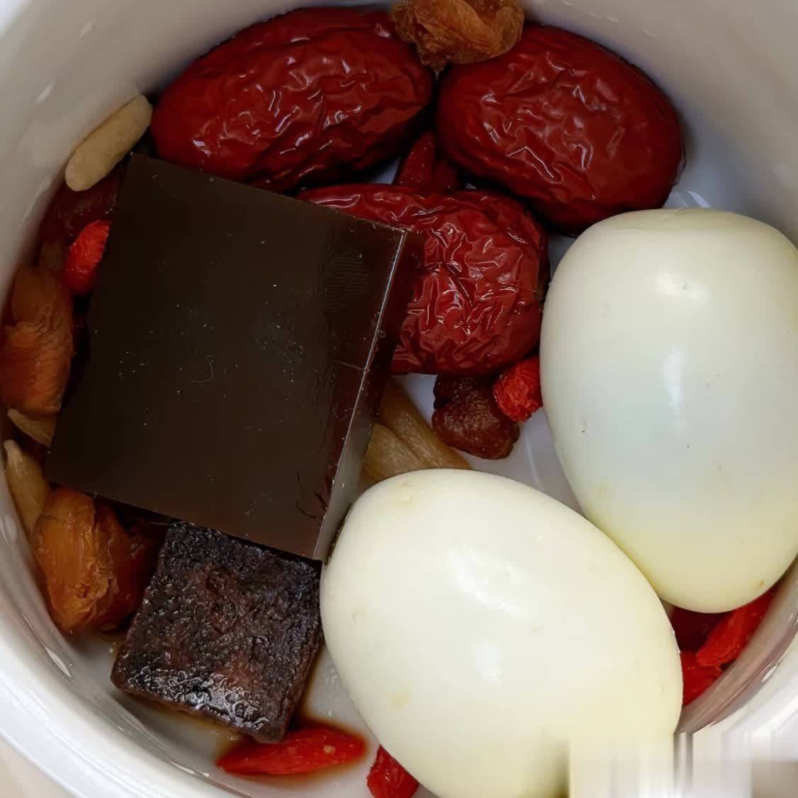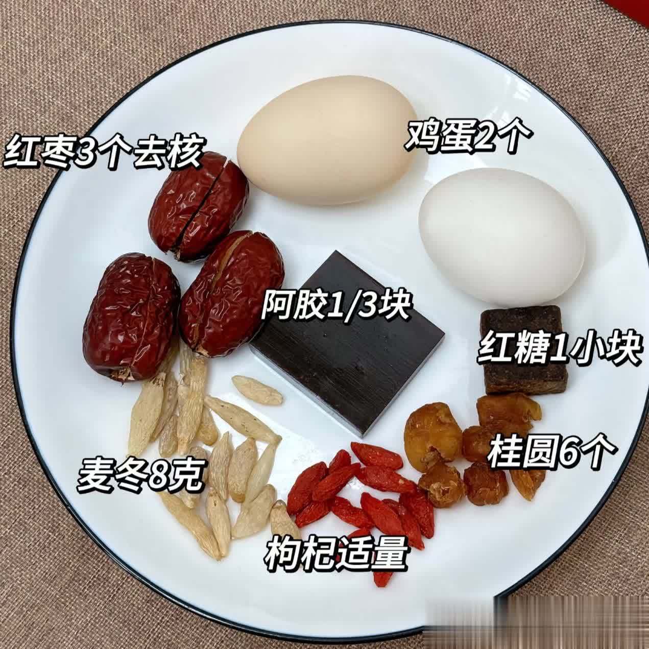 气需补补的姐妹快试试!食材配比:阿胶1/3块、红枣(去核)3颗、鸡蛋2枚、桂圆6颗、麦冬8克、红糖1块、枸杞适量